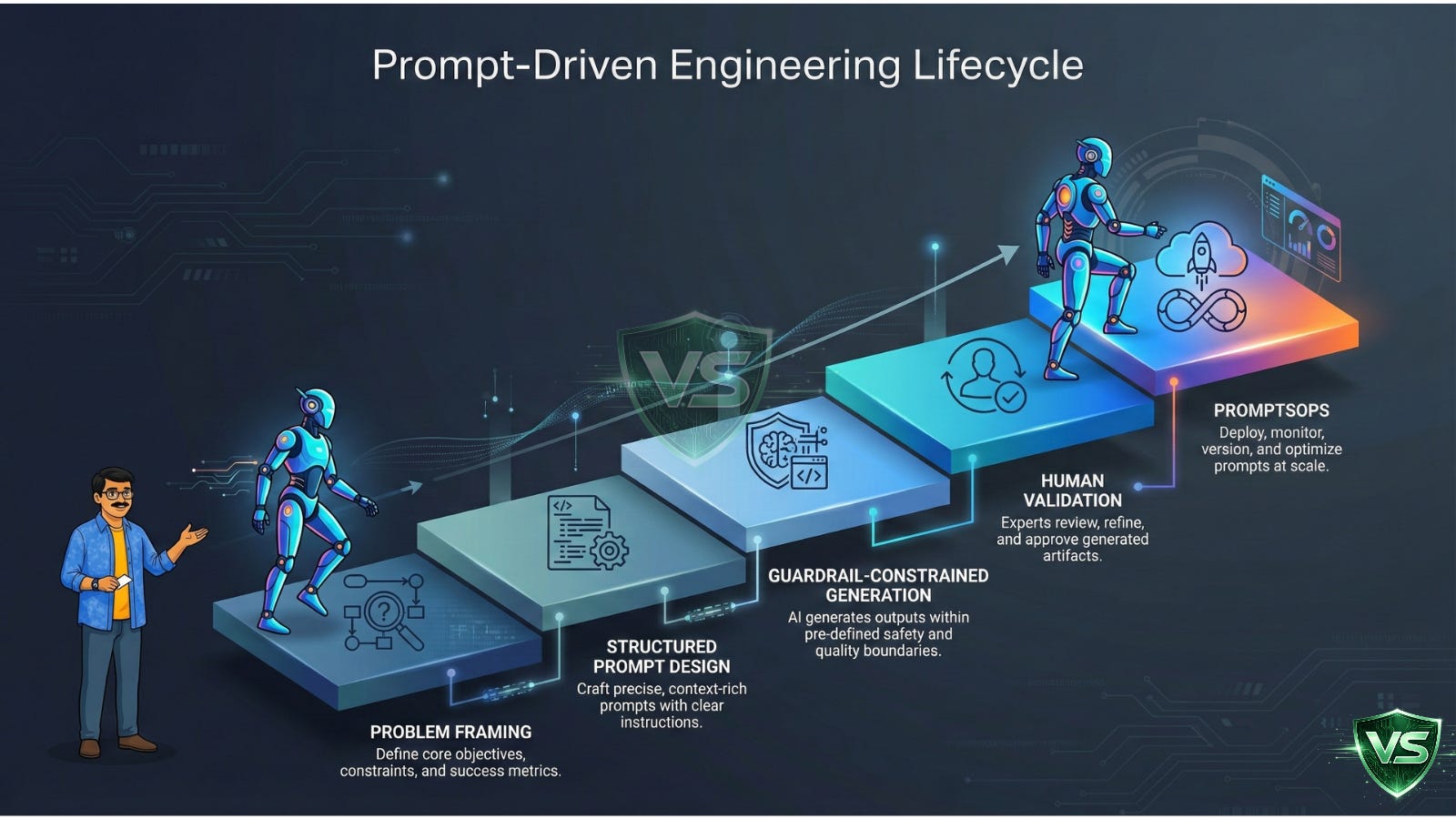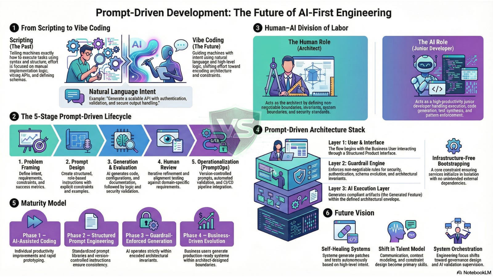AI-assisted coding → Structured prompt engineering → Guardrail-enforced generation → Business-driven product evolution